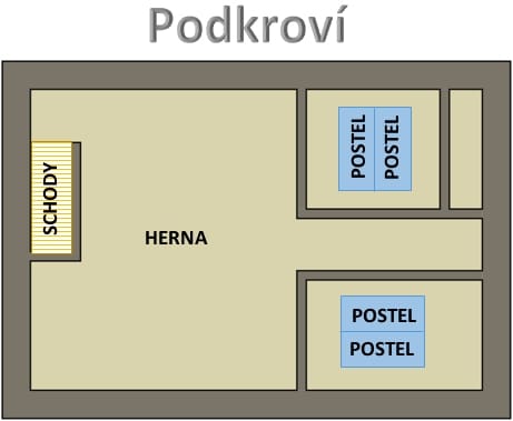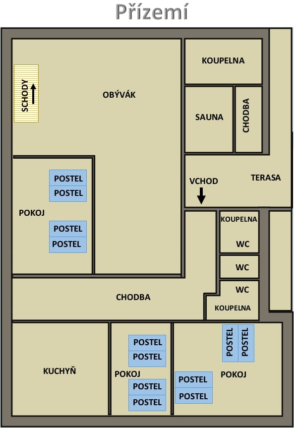 Teplota v chatě se reguluje termostatem a hlavicemi na jednotlivých radiátorech. Termostat je umístěn v rohovém pokoji na zdi. Teplota se nastavuje otočným kolečkem. Objeví-li se na displeji jiné funkce termostatu, stiskněte symbol ‘DOMEČEK’, který vás vrátí zpět do hlavního menu na nastavení teploty.